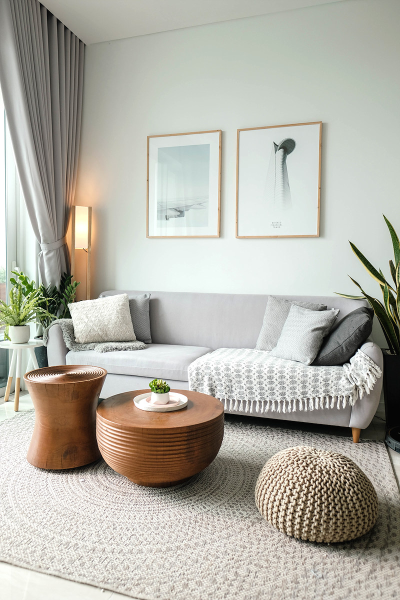 회색으로 주요 패브릭 색을 맞추니까 통일감이 듭니다. 나머지 테이블이나 협탁, 액자의 테두리는 모두 원목 고유의 색을 살려서 멋스러움을 더합니다.