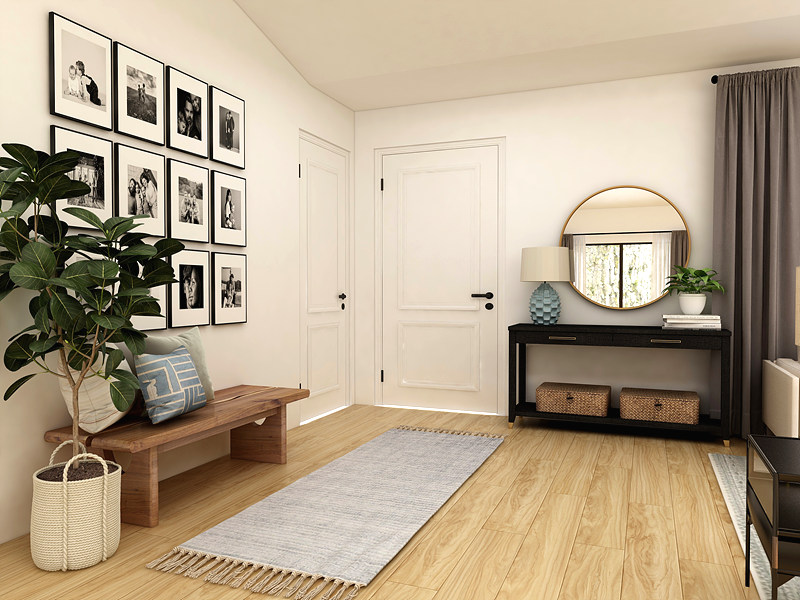 멋스럽게 가족 사진들을 액자로 걸어놓은 벽에 놓인 화분이 멋스러우며 건너편에 거울 앞에도 작은 소품을 가져다 놓아서 배치되는 느낌이 멋집니다