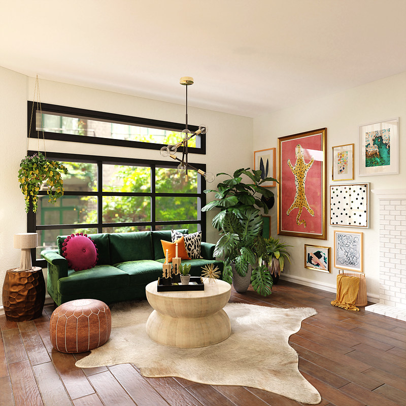 녹색 소파와 그 옆으로 잎이 커다라고 멋스러운 반려식물이 배치되어 있습니다. 요즘 저 잎이 독특해서 많이 키우는 스타일입니다.
