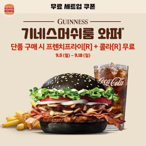 기네스 와퍼, 기네스 머쉬룸 와퍼, 기네스콰트로치즈 와퍼를 주문하실 때 이 쿠폰을 당당하게 사용하셔서 무료 세트업 받으시기 바랍니다.