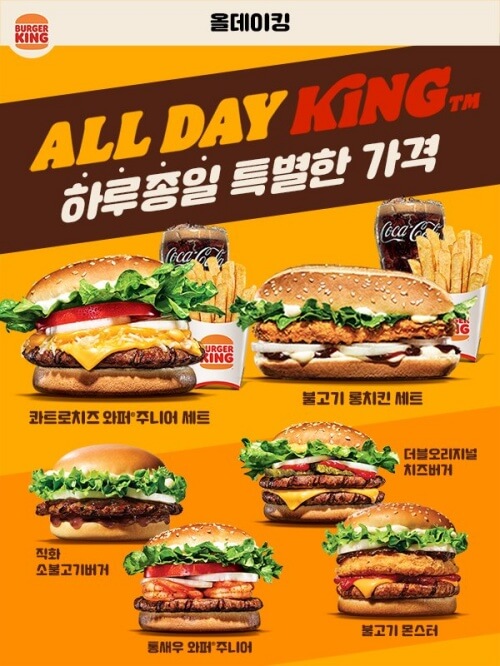 버거킹 올데이킹은 하루종일 저렴한 가격으로 먹을 수 있는 저가형 메뉴들입니다. 가격만 저가이지 맛까지 저가는 아닙니다. 콰트로치즈 와퍼 주니어 같은 것 드셔보세요. 사이즈만 작지 와퍼하고 맛은 똑같습니다.