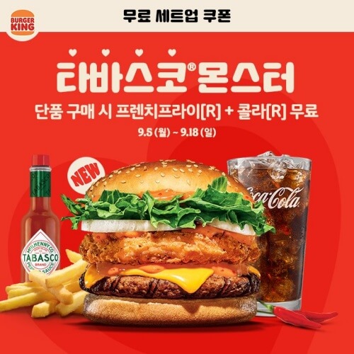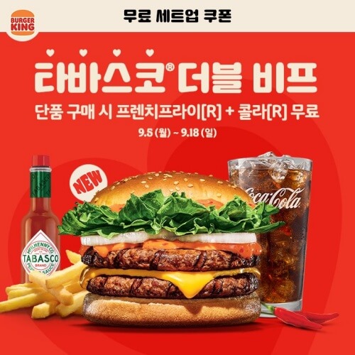 매주 업데이트 되는 버거킹 행사 정보 미리 알아두시면 좋습니다. 보통 버거킹 행사는 월요일에 시작해서 일요일에 끝나지만 추석 연휴 등으로 일정이 바뀌기도 합니다. 버거킹 9월 행사가 그런 경우죠. 추석으로 인해 이번주의 행사는 4일간 텍사스칠리 와퍼, 텍사스칠리 치킨버거 무료 세트업으로 진행됩니다.