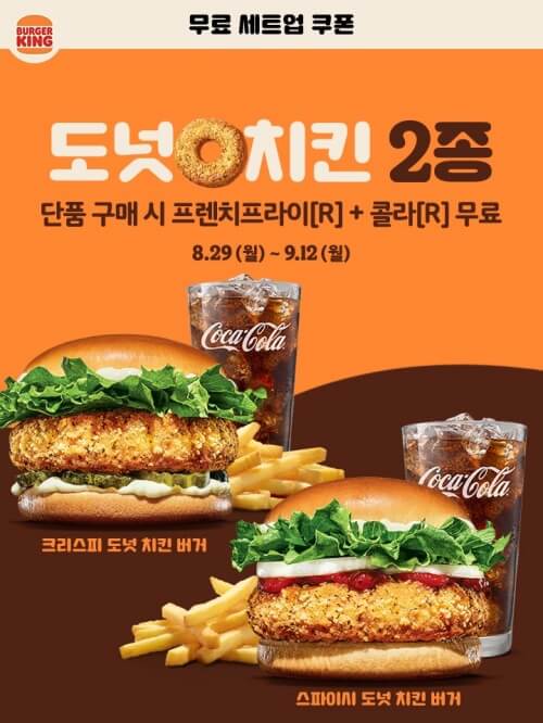 도넛치킨 2종, 즉 크리스피 도넛 치킨 버거와 스파이시 도넛 치킨 버거 2종도 무료 세트업 쿠폰을 나눠줍니다. 이렇게나 버거킹 행사 쿠폰이 많은데 정가로 드신다고요?